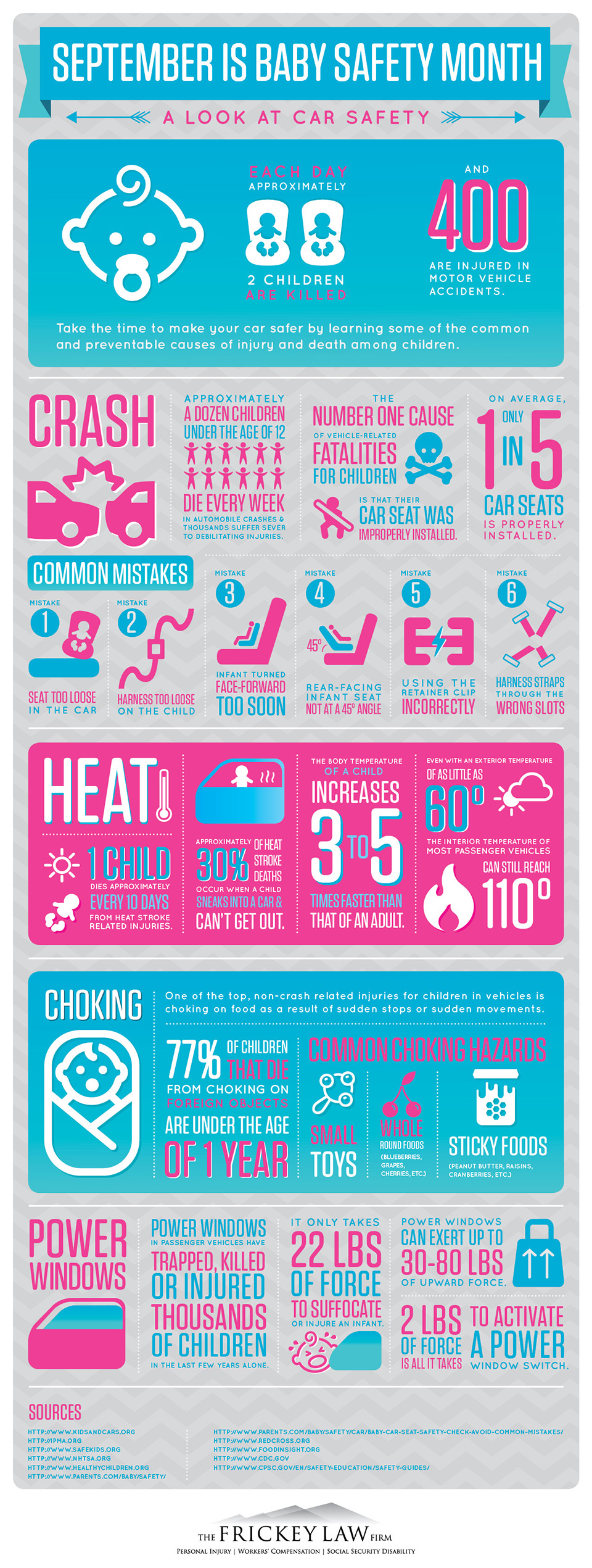 The infographic below was created to help illustrate four common hazards your baby may face at any given time when in a car. Prevention will go a long way towards ensuring your baby lives a long, full, and happy life.